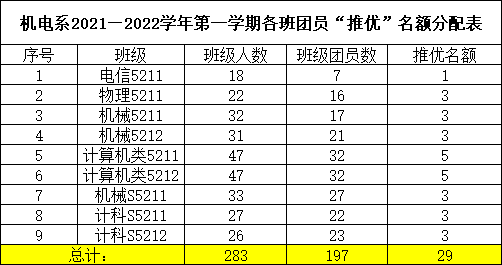 根据太阳集团tyc9728团委《关于做好2021年下半年团员“推优”工作的通知》要求,现将机电系各团支部团员“推优”名额分配公示如下: