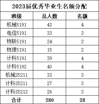 全院应届毕业生总人数的 10%以内(28人)。结合评选条件及各班综合表现,确定各班级优秀毕业生名额如下。