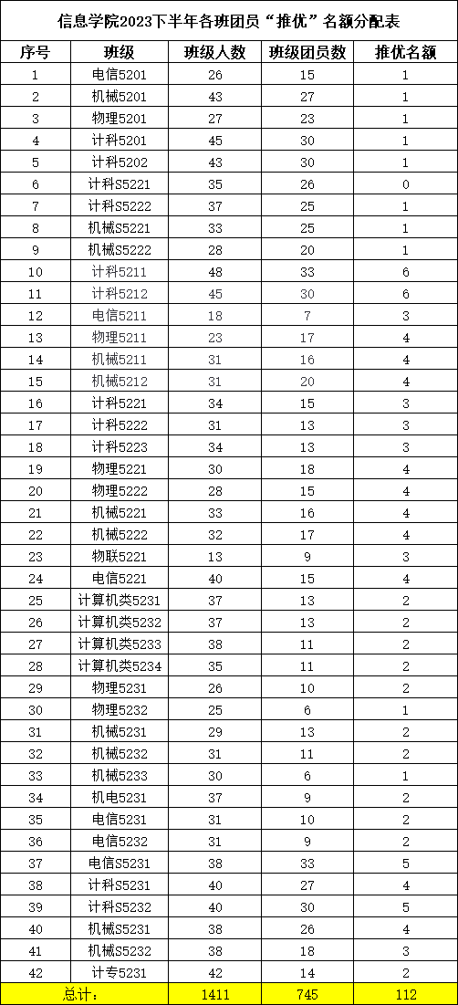 根据太阳集团tyc9728团委《关于做好2023年下半年团员“推优”工作的通知》要求,现将太阳集团tyc9728各团支部团员“推优”名额分配公示如下: