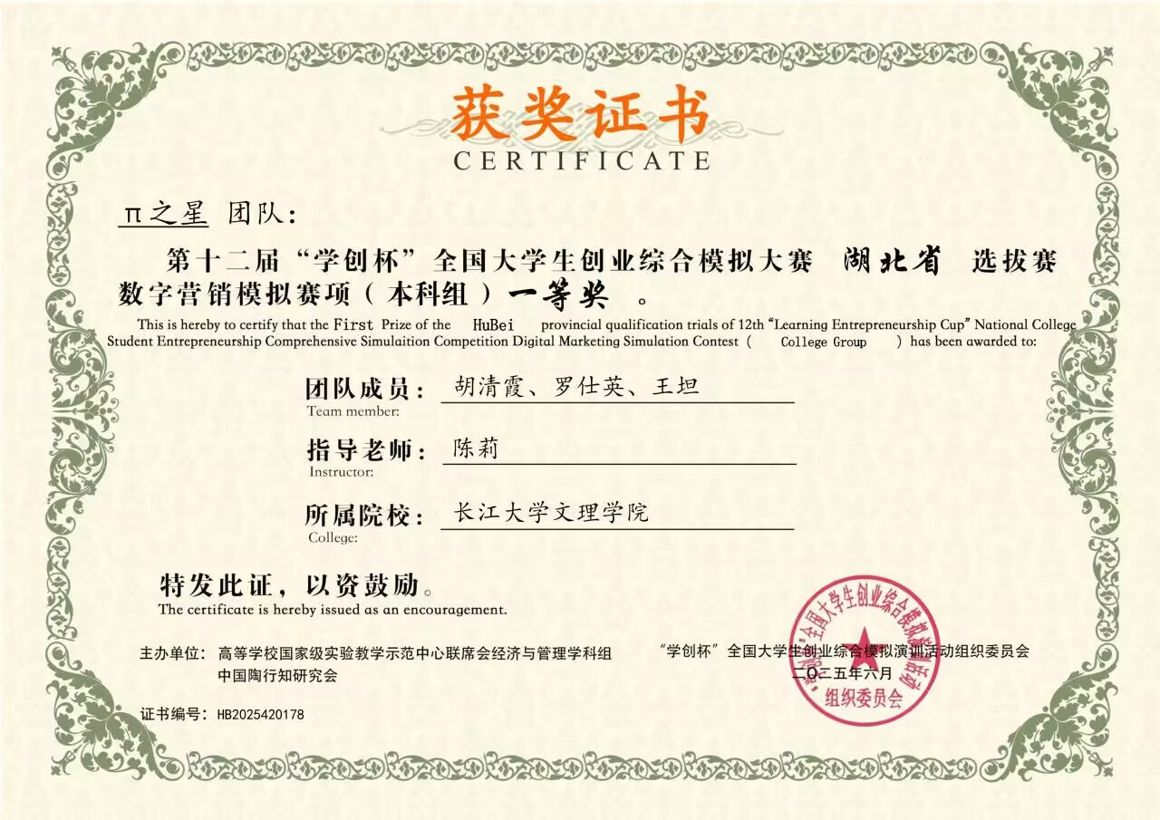 第十二届“学创杯”全国老员工创业综合模拟大赛湖北省选拔赛数字营销模拟赛项(本科组)一等奖