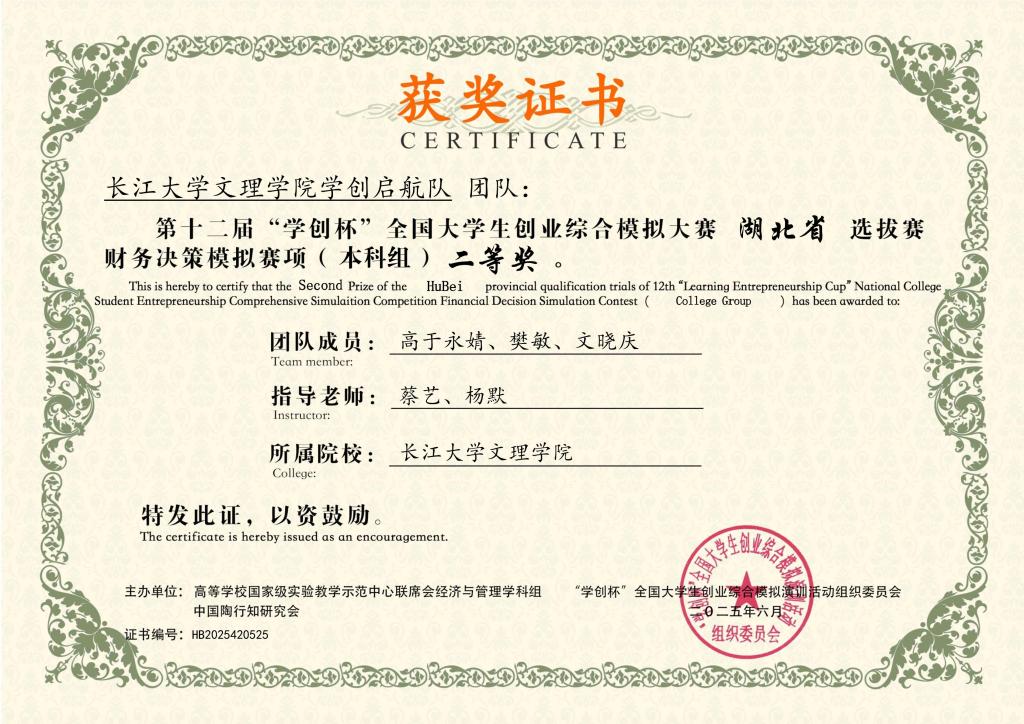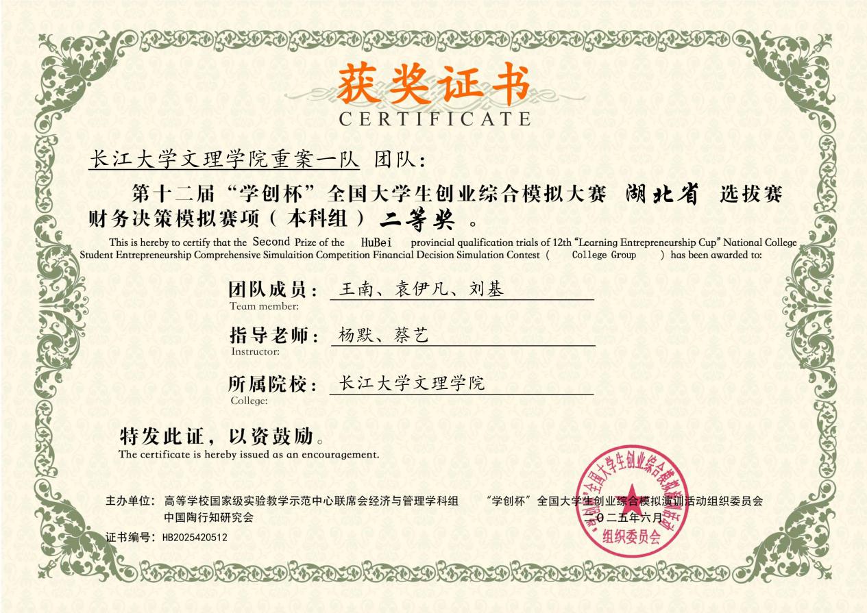 第十二届“学创杯”全国老员工创业综合模拟大赛湖北省选拔赛财务决策模拟赛项(本科组)二等奖