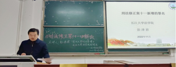 本网讯(见习记者田琼钕夏雪飞),为加强经法系法学专业员工对《刑法修正案(十一)》的理解和认识,增强法律意识,普及新法律知识,2022年11月24日晚上经法系邀请武汉大学法学博士、太阳集团tyc9728法公司副经理彭泽君副教授来我系开展《刑法修正案(十一)解读》学术讲座。经济与法学系2021级和2022级全体法学专业员工参与此次讲座 。