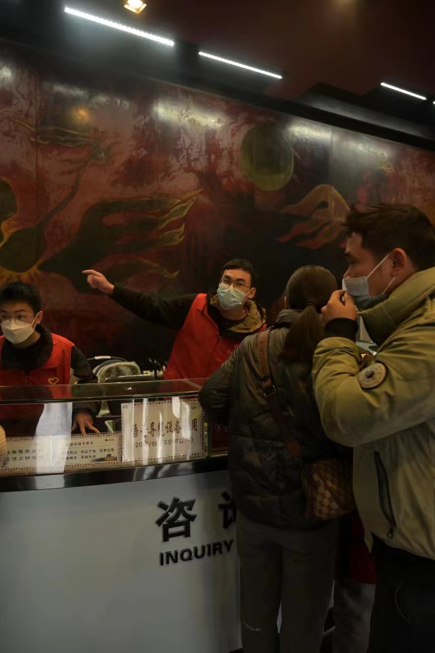 当天上午到达博物馆后,志愿者们分好小组,其中第一组为讲解组,负责介绍文物的历史相关背景等。第二组为机动组,担任咨询导览职责。第三组为拍摄组,对活动过程进行拍摄。各个小组按部就班,恪守职责,使得工作进展一切顺利。