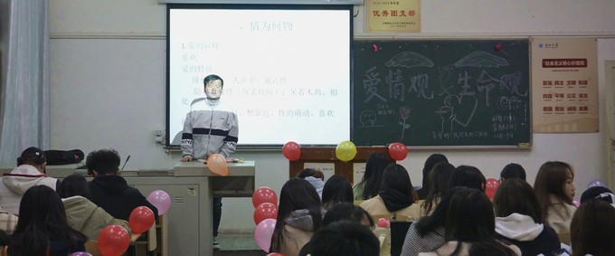 其中,法学5191班从“什么是喜欢?什么是爱?”、“生活中的爱”、“ 爱是什么?”、“如何爱?”、“恋爱与博爱的关系”五方面开展此次心理班会。通过播放《泰坦尼克号》的电影剪辑,让同学们更好的了解什么是真正的爱。强调激情、亲密、承诺共同构成完美爱情。金融5171班则从“生命的价值”、“如何实现生命的价值”两方面对同学们进行生命观教育,强调同学们应当有明确的目标、有必胜的信念、有明确的行动和饱满的热情,这样才能实现自己的人生价值。金融5182心理委员在班会最后说到:“生命诚可贵,自杀不可取。在遇到挫折时,我们应该笑看人生,以积极乐观的态度去面对,那么一切都会迎刃而解。”其他班级也通过PPT讲演和观看视频的方式对本次主题内容进行了学习。