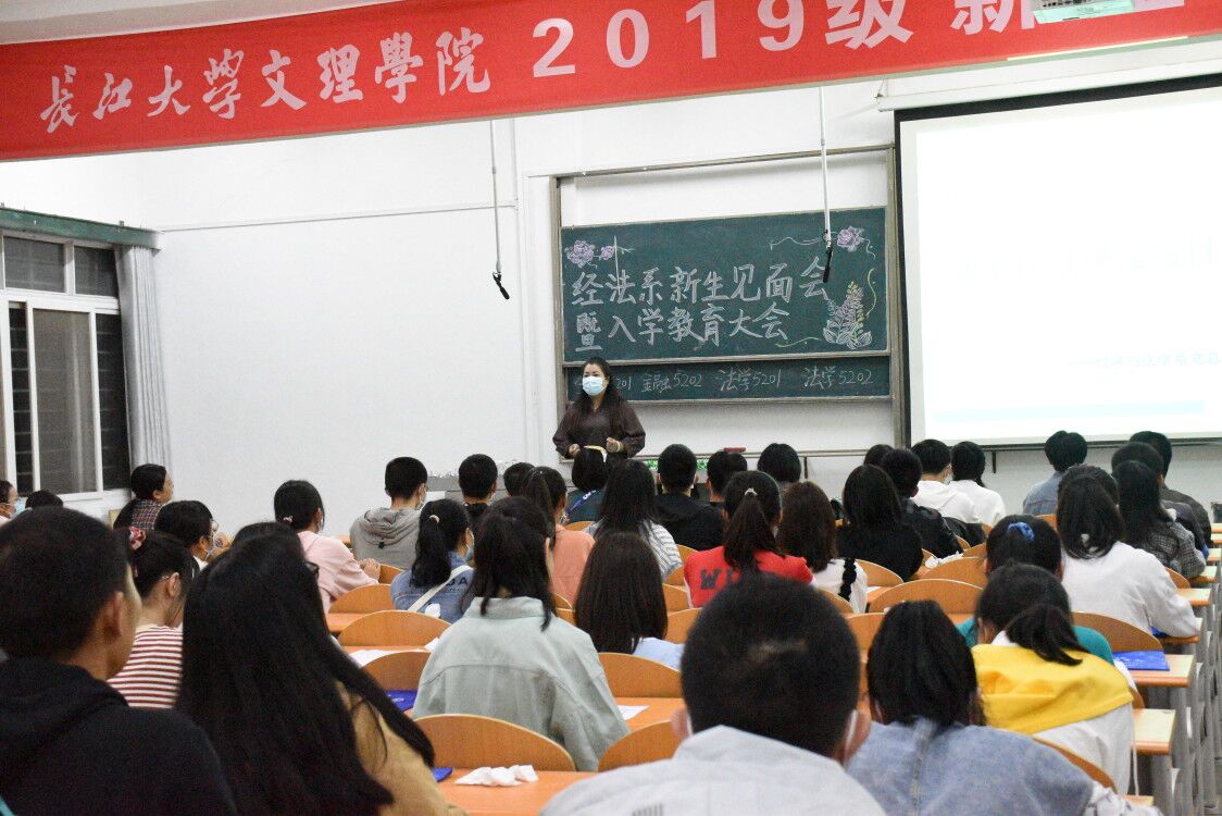 本网讯(通讯员:邓安琪、阮文彦)为了让20级新生更好的融入老员工活和我们的经法系大家庭,我系于9月23日晚6:30在4教500召开了迎新见面会,经法系20级全体新生参加。系主任万楚军、党总支书记李成军、副主任罗明、法学教研室主任周密、金融学教研室主任陈莉、国贸教研室主任孙颖、辅导员卢佳智、文国霞,滕宋云老师参加了会议,此次会议由党总支副书记杨杉杉主持。