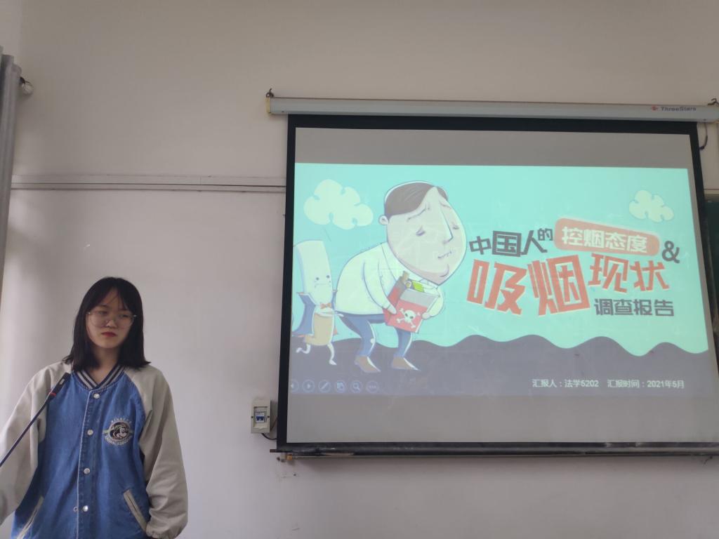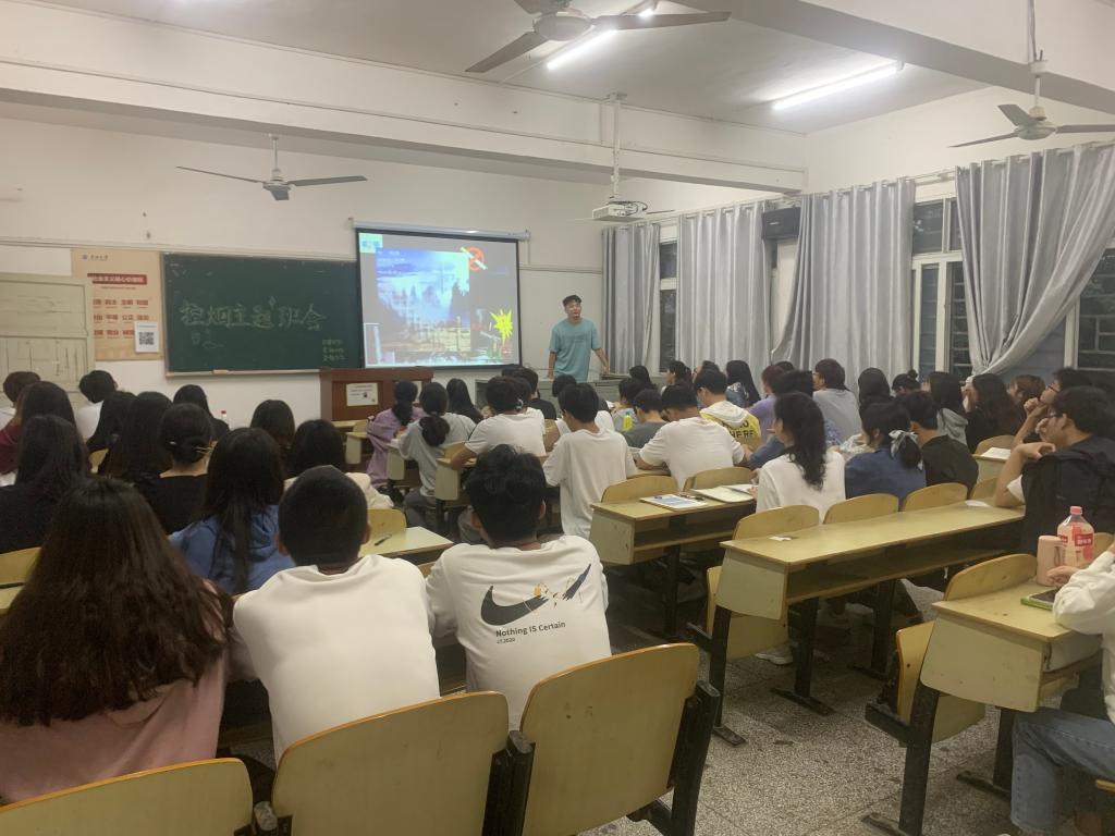 班会开始,主讲人通过展示PPT、播放关于吸烟有害健康的视频等方式让同学们对香烟带来的危害有更深层次的认识。其中,法学5201班主讲人通过分享案例为同学们讲述了香烟带来的严重危害;金融5191班主讲人具体分析了吸烟对人体器官患病的影响,并且邀请了一位曾经吸烟的同学上台分享自己的戒烟经历。最后,同学们也积极分享了自己对禁烟的看法。