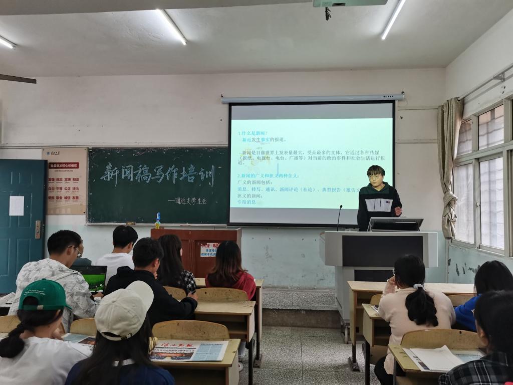 活动开始,郁鑫为大家讲解新闻撰写的格式、要素、语言要求等基础知识。同时,他将新闻部两名干事的新闻稿作为范例讲解,指出新闻稿中的错误、用词不当等问题,也表扬了其中精炼的语句。