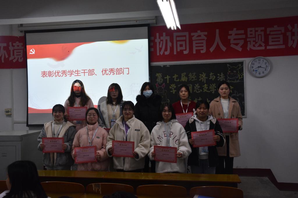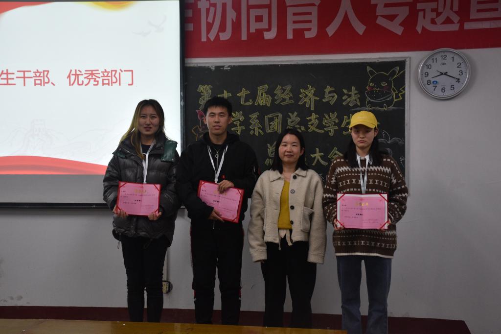 本网讯(员工记者 龚千惠 见习记者 陈燕妮 李雅雯 张明杰)12月20晚7时,经法系第十七届团总支员工会、志愿者服务队在四教301举行了年终总结大会。党总支副书记杨杉杉、辅导员卢佳智、文国霞、滕宋云出席本次会议,本次大会由秘书处干事陈照主持。