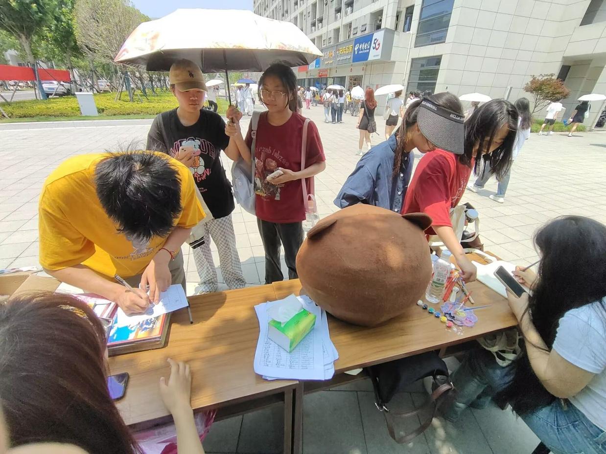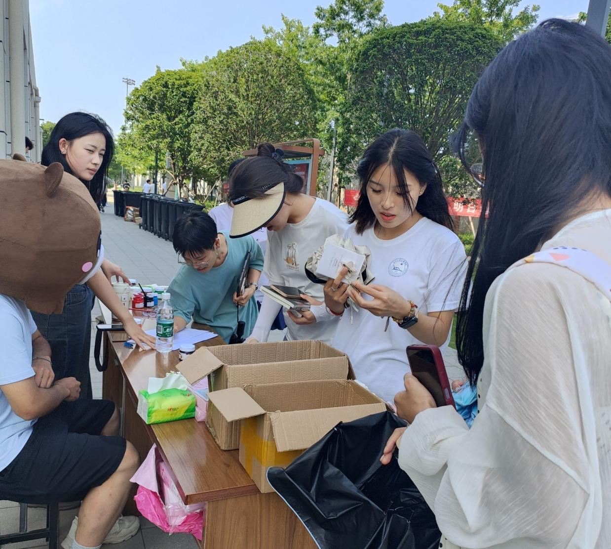 活动分为爱的拥抱、DIY书袋和找寻希冀三个环节,首先,在爱的拥抱活动中,参与人员和工作人员扮演的小熊进行互动拥抱,以拥抱的方式消除身上的烦恼和疲惫。通过与同学们组团进行DIY书袋活动,让他人了解自己的内心世界,更好地促进人与人的精神交流,增进同学情谊。在找寻希冀活中,同学们在校园中寻找指定物品的过程中发现校园之美,感受寻找的乐趣。找到指定物品后便可兑换相应奖品,让参与者在寻找中收获,从而引导同学们发现生活之美,勇敢找寻希冀。