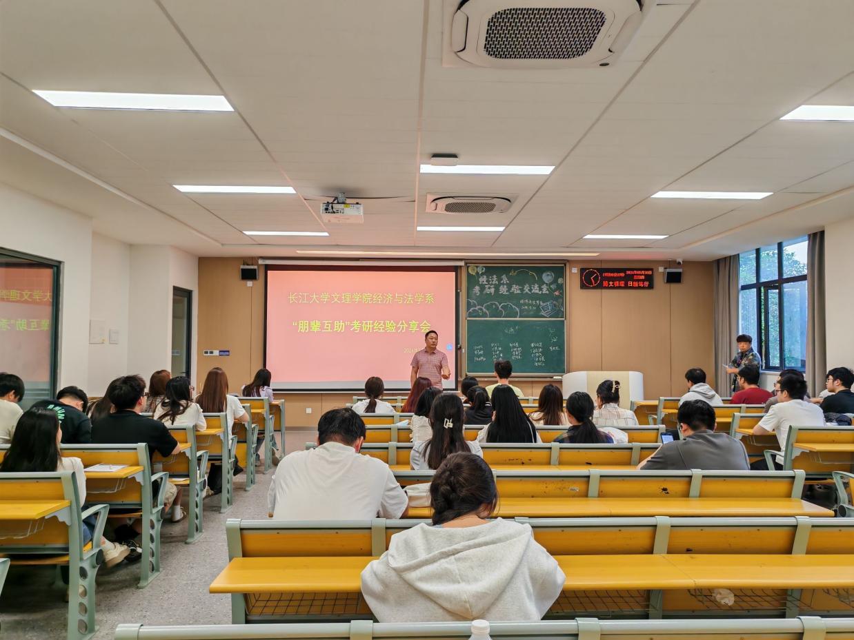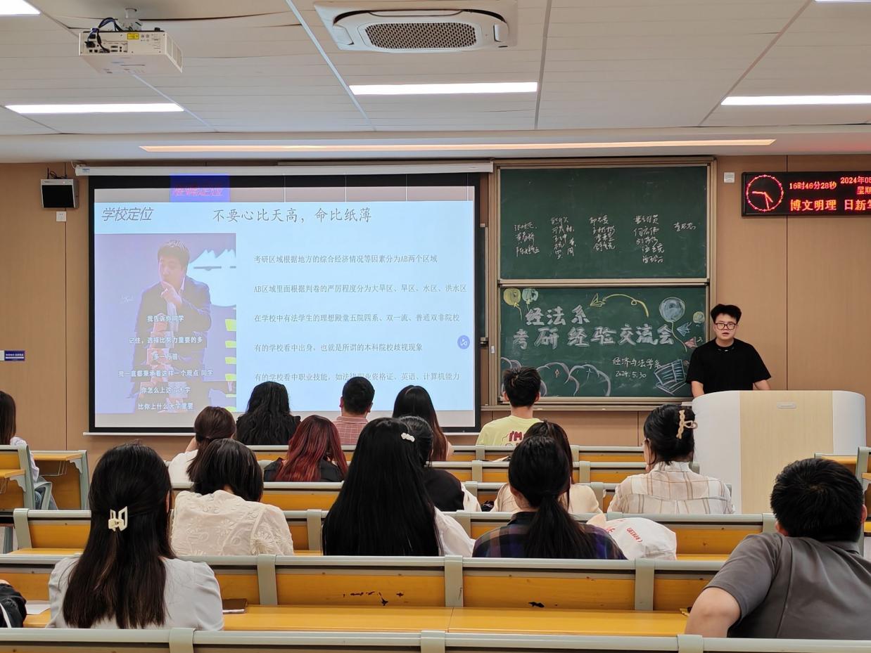 本网讯(见习记者:郑兴冰 于琪琪)为扎实推进公司“两康一训”教育工作,进一步帮助经法学子明确考研目标、熟悉备考流程、提高考研能力,充分发挥朋辈互助,示范引领作用,经济与法学系于5月30日在C-119M教室开展“朋辈互助”考研经验交流会暨考研班班会。系党总支书记辛裕,副书记杨杉杉,辅导员卢佳智、刘曼莹,2024届优秀考研代表唐怡维同学以及2025届考研班同学共五十余人参与,本次会议由卢佳智主持。