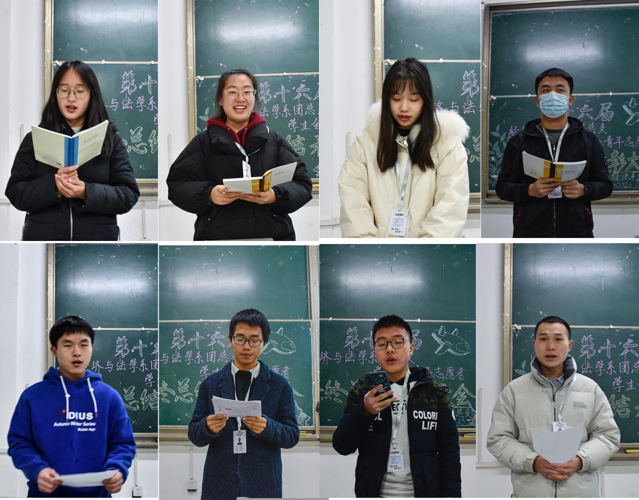 大会第二项,部门代表及主席团、志愿者队长发言。首先,组织部部长石烨对其部门工作进行了汇报总结,提出要借鉴以往的经验,更好的开展下一年度的团学工作。其次,青年志愿者队长程遥指出对于“态度热情,投入不足”问题需要端正良好态度,以积极饱满的热情开展工作。最后,由团总支员工会副书记侯玉婷做出以下要求:第一,工作要及时;第二,工作上多注意细节;第三,多沟通多交流。会议的第三项,由卢佳智老师宣读经法系团总支员工会表彰文件,党总支副书记杨杉杉老师为组织部、女生部、外联部、心委部四个优秀部门颁奖,卢佳智老师为陈旺等9名优秀员工干部颁奖。