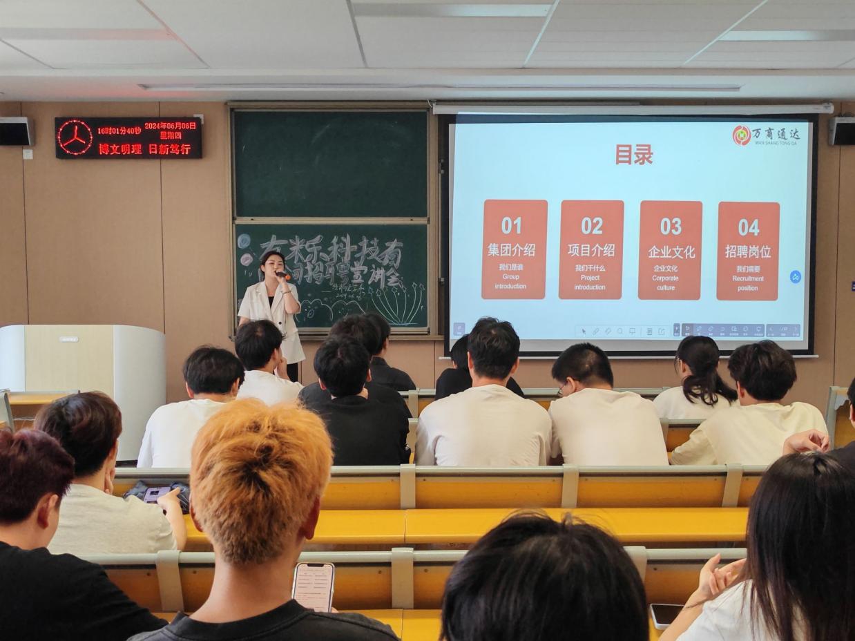 接着,唐诗经理向同学们介绍了公司的发展概况、经营理念、企业文化、业务范围、人才晋升渠道等内容。结合岗位需求介绍公司所拥有的广阔的发展平台、完善的培训体系和良好的工作氛围;并就同学们关心的薪资待遇、人才发展、办公条件、生活环境、业余活动等方面进行了详细解答。同学们对友米乐科技有限公司有了更加全面且深入的了解。在宣讲过程中,唐经理还结合自身的职业经历,分享了一些求职就业的经验与建议。她鼓励同学们树立正确的就业择业观,明确自己的职业定位和发展方向,不断提升自己的综合素质和专业技能,勇于挑战自我,敢于面对困难。