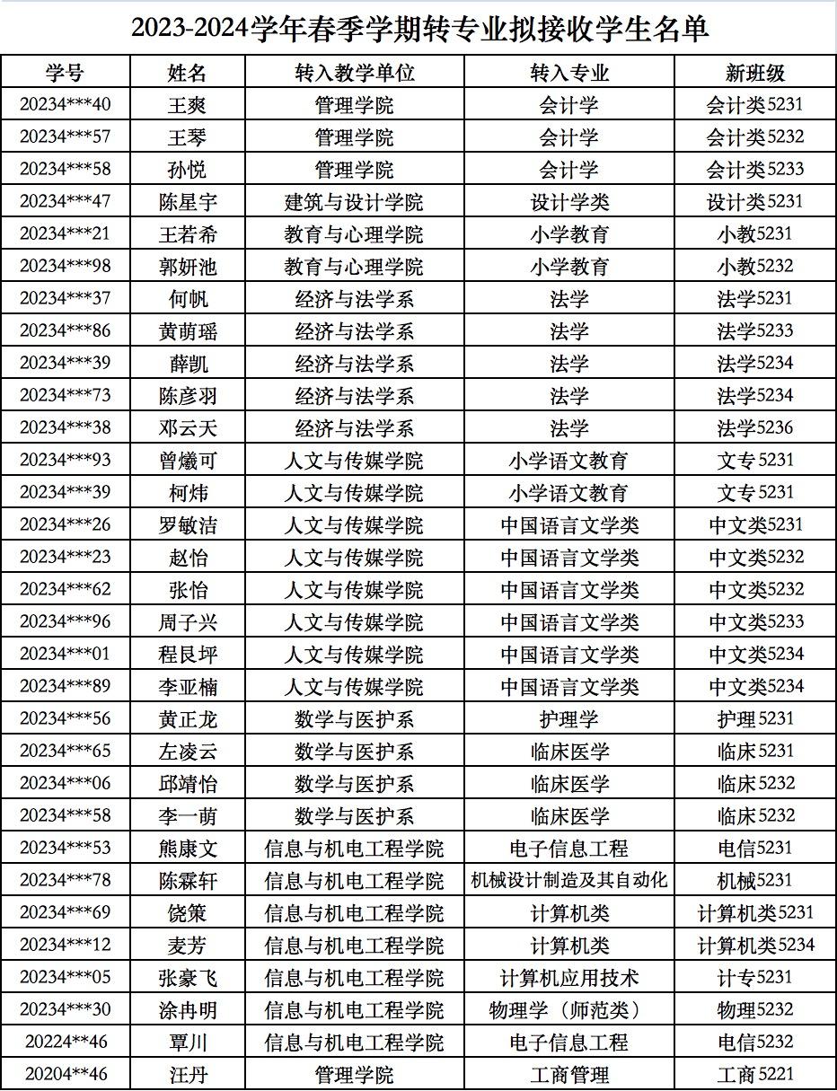 根据《太阳集团tyc9728专业分流与转专业管理办法》(文理行发〔2023〕64号)文件精神,按照转专业相关工作要求,经员工本人申请,招生处及所在教学单位审核,申请转入教学单位综合考核,教务处复核,拟同意王爽等31名同学转入新专业学习,现将结果予以公示(见附表)。