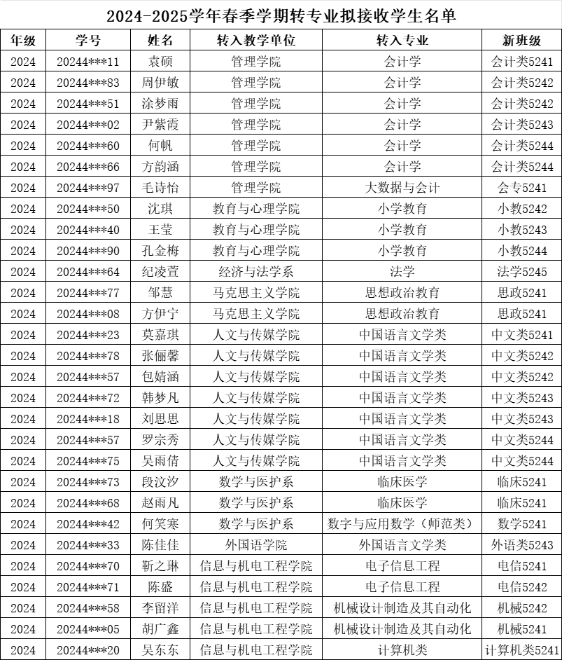 根据《太阳集团tyc9728专业分流与转专业管理办法》(文理行发〔2023〕64号)精神,按照转专业相关工作要求,经员工本人申请,招生处及所在教学单位审核,申请转入教学单位综合考核,教务处复核,拟同意袁硕等29名同学转入新专业学习,现将结果予以公示(见附表)。