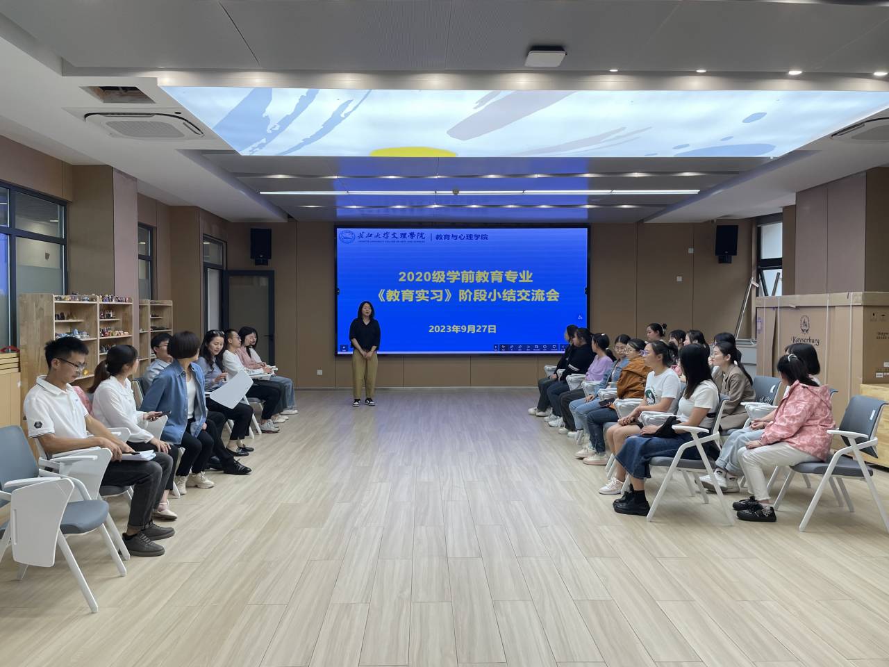 本网讯(通讯员余晓娇)9月27日下午,公司组织2020级学前教育在荆实习的14名员工,在实验楼A407开展教育实习月汇报活动。部分幼儿园负责人代表、太阳集团tyc9728经理徐霄、副经理马君莉、学前专业部分教师和辅导员参加活动,活动由肖雅筠主持。