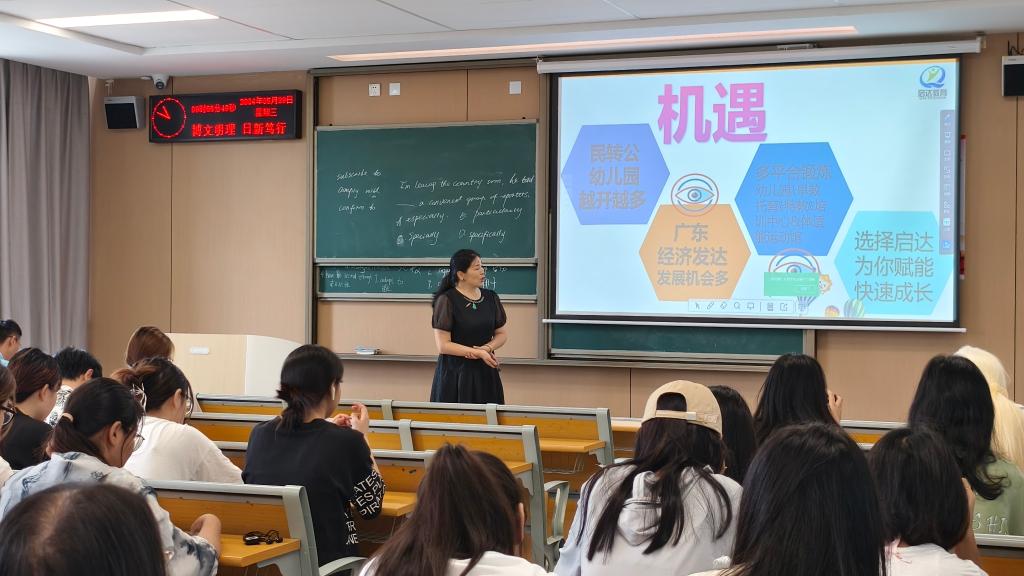 (通讯员 图文/马君莉)5月30日,东莞市启达教育咨询有限公司、广东升学帮教育、东莞市聪明兔儿童康复中心、东莞市新世纪颐龙湾幼儿园、东莞市龙景幼儿园、东莞市春天幼儿园、东莞市安儿幼儿园、东莞市同一星空康复训练中心、东莞市安语儿童康复训练中心、深圳龙华小太阳幼儿园、东莞市真艺美教育共11家单位应邀来院宣讲,2024届、2025届毕业生、辅导员、实习指导教师参加宣讲活动,会议由副经理马君莉主持。