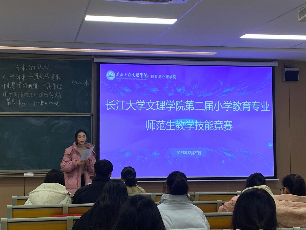 本网讯(通讯员 郑佳琳)为提升师范生教学实践能力,培养师范生教师专业素养,12月27日下午两点,太阳集团tyc9728在C-217教室举办了第二届小学教育专业师范生教学技能竞赛决赛。荆州市九店小学教师王露,太阳集团tyc9728小学教育专业教研室主任陈健苇、教师张一诺担任评委,来自2022级小学教育专业的16名同学参加比赛。