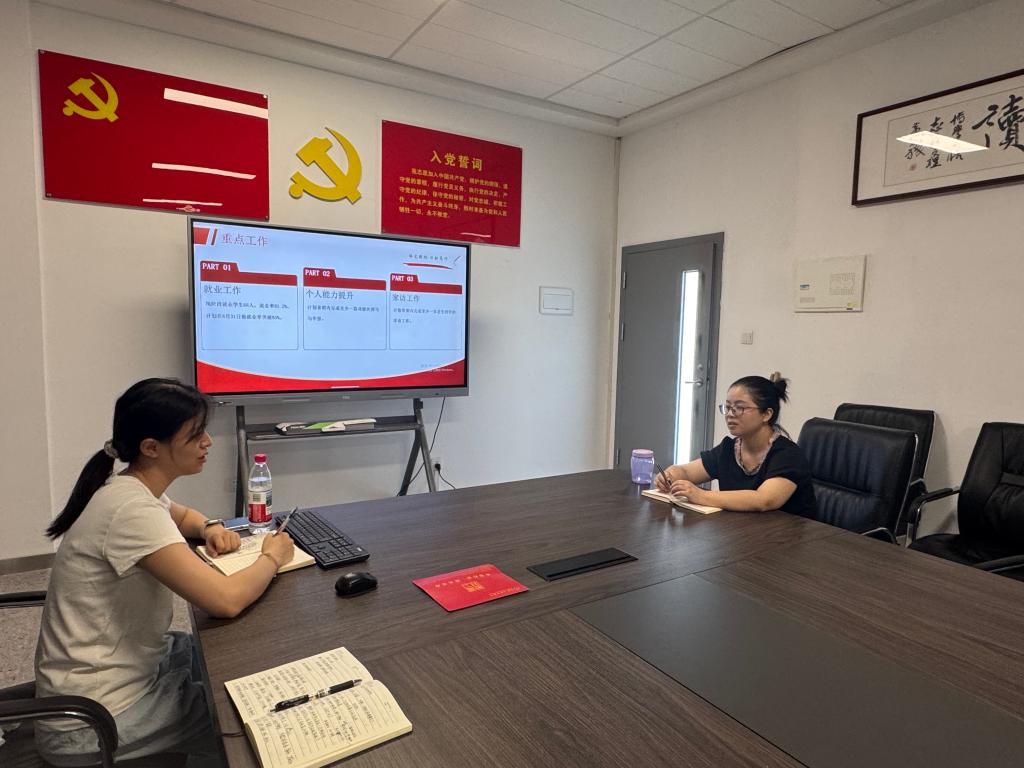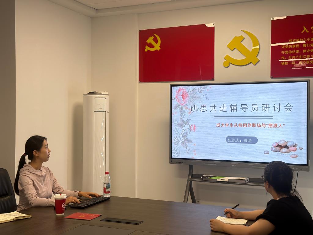 (通讯员 图文/李晓怡)7月9日下午,公司学工队伍在会议室开展第三期“研思共进”辅导员学习交流会,教育与心理公司党总支书记祝峰,副书记梅曼曼及辅导员李晓怡、彭盼参会。