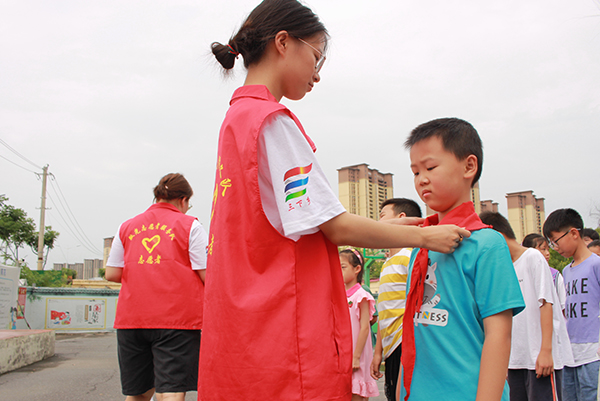 本网讯(通讯员 程欣悦)近日,教育与心理系微光志愿者服务队“七彩假期·三下乡”暑期社会实践团队来到沙市区立新乡红门路小学,开启了近两周的支教生活,围绕思想引领、身心健康、快乐学习、文明生活、文化传承、艺术素养、科技创新七大主题开展志愿服务活动。7月5日上午,微光志愿者服务队在红门路小学开展“同怀爱国心,共升一面旗”庆祝中国共产主义青年团成立100周年主题升旗仪式,志愿者代表及红门路小学“七彩假期”夏令营员工共120余人参加仪式。
