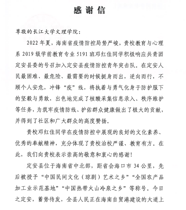 本网讯 近日,共青团定安县委员会发来感谢信,对公司教育与心理系学前教育专业5191班邓红佳积极参与海南省疫情防控工作的行为予以表彰。