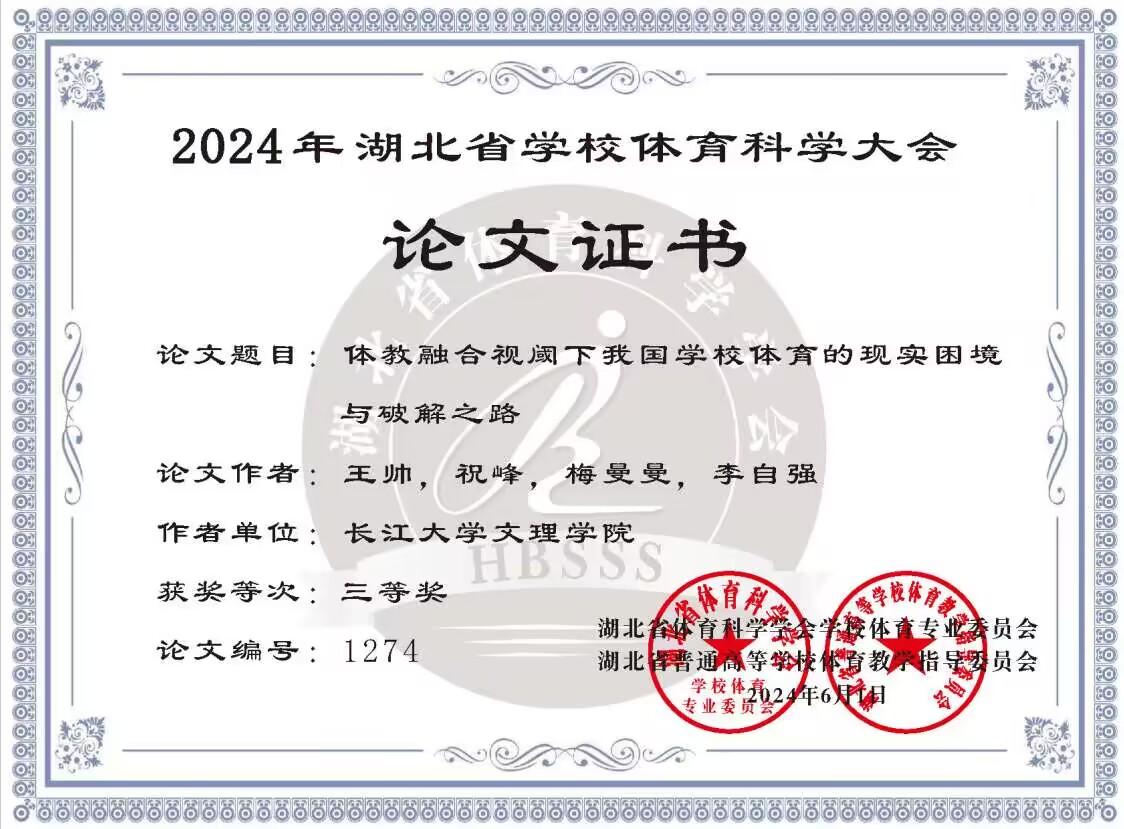 据悉,本次大会共收到来自全省各有关单位和个人报送的论文1741 篇,经论文学术不端系统检测、人工筛查和专家评审等程序,录取论文1082 篇,公司太阳集团tyc9728教师王帅、祝峰、梅曼曼等人撰写的论文《体教融合视阈下我国公司体育的现实困境和破解之路》获三等奖。
