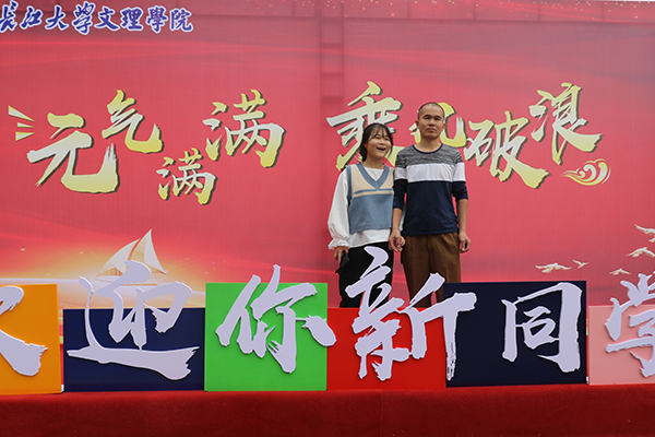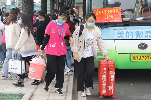 经理王文凯(右三)、党委副书记孙细望(右五)在寝室与新生交谈