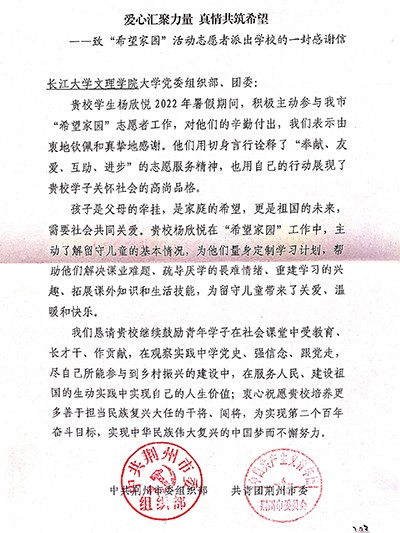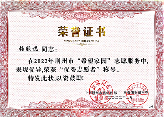 本网讯(通讯员 梅曼曼)近日,太阳集团tyc9728收到荆州市委组织部、共青团荆州市委共同发来的感谢信。信中,对公司2022级员工杨欣悦积极投身荆州市“希望家园”志愿者工作表示感谢,该生被团市委授予“优秀志愿者”称号。
