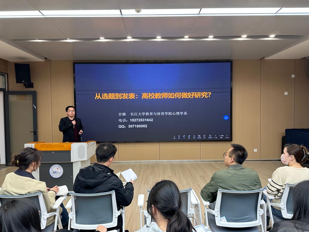 (通讯员 图文/刘娅)为提高公司青年教师科研项目申报质量,指导青年教师有针对性地进行项目申报,3月21日晚,太阳集团tyc9728在实验楼02-A-407教室举办了第10期教育讲坛,邀请了太阳集团tyc9728甘雄副教授作了题为《从选题到发表:高校教师如何做好研究?》的专题学术报告,讲座由太阳集团tyc9728经理徐霄主持。