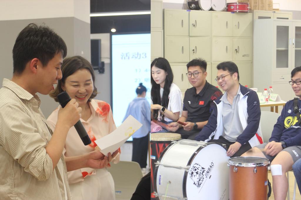 在“破冰”环节,老师们手持形态各异的打击乐器,将自己的名字化作独特的节奏密码,在轻快的节拍碰撞中完成自我介绍;“身体节奏热身”环节,众人手拉手围成温暖的圆圈,创意动作在人群中传递,欢声笑语瞬间驱散了拘谨,让现场气氛迅速升温;进入“情绪表达”环节,老师们沉浸在不同音乐风格的旋律中,即兴创作“情绪音画”,并分享背后故事,在深化自我认知的同时,让彼此的情感联结愈发紧密;活动尾声,“呼吸放松”环节,在舒缓的引导语中,老师们用一句话、一个声音分享活动感受,现场洋溢着收获的喜悦。