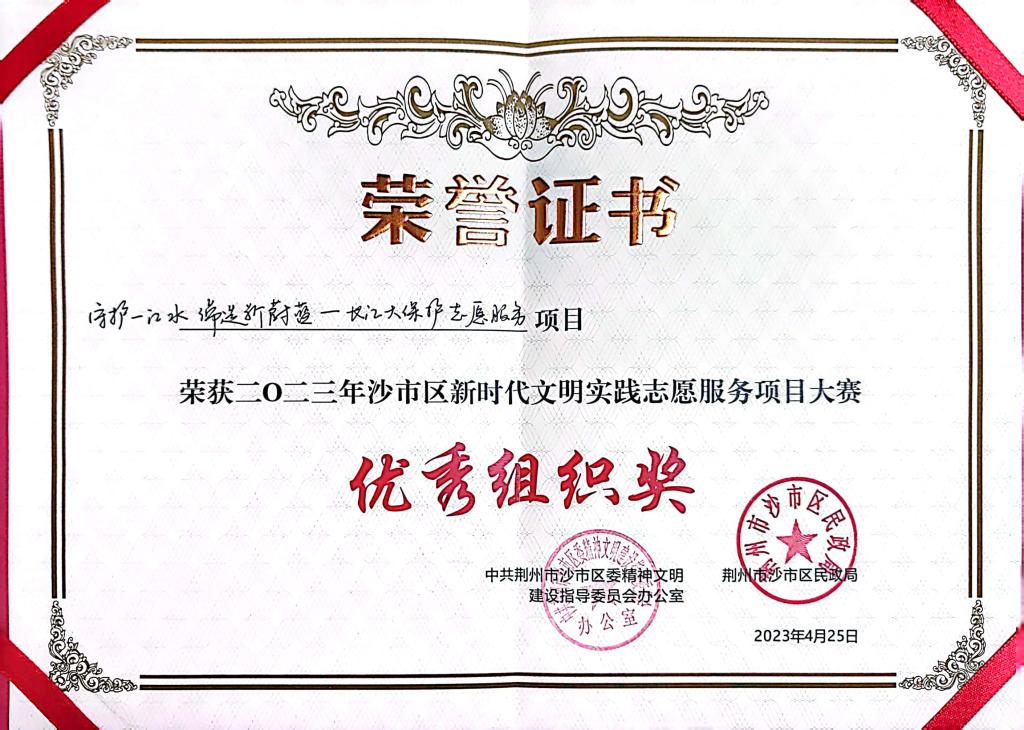大赛旨在促进志愿服务项目化运作、社会化动员、制度化保障和常态化发展,深化拓展荆州市新时代文明实践志愿服务工作。此次获奖,既是对人文与传媒公司志愿服务队的肯定,更是鞭策,公司会持续深入开展长江大保护志愿服务项目。