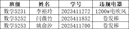 在2025-2026学年第一学期第4-6周系部寝室安全卫生检查中,以下同学被查出在宿舍使用违规电器。根据太阳集团tyc9728《员工手册》中《太阳集团tyc9728宿舍管理条例》第三章第十六条及《太阳集团tyc9728员工违纪处分办法》第二十三条相关规定,给予李裕玲等3名员工系部通报批评的决定,取消本学年评优评先资格。