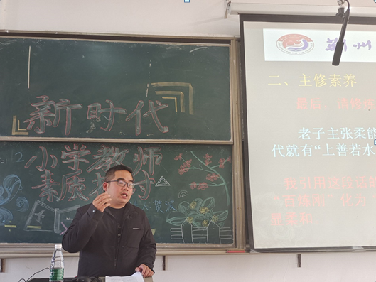 贺波主任以“琢磨讲台·主修素养”作为本次讲座的主要内容。“琢磨讲台”主要分为两个部分,一是做“讲台之下”的真功,二是拓展“讲台之下”的范围。做“讲台之下”的真功告诉同学们应吃透教材,需研究员工,要关注得失,做好反思。拓展“讲台之下”的范围就是要拓展知识范围和信息范围,贺主任借用鲁迅先生的名言告诫同学们应如何做一名优秀教师。“主修素养”是对老师素养的基本要求,贺主任提出作为新时代小学教师应先修炼微笑,具备敬业精神,修炼为人处世的态度,并对同学们提出的问题进行解答。讲座结束后,史千里老师做出总结,新时代小学教师要做好人才教育、热爱员工、兢兢业业、潜心钻研、博学多才。
