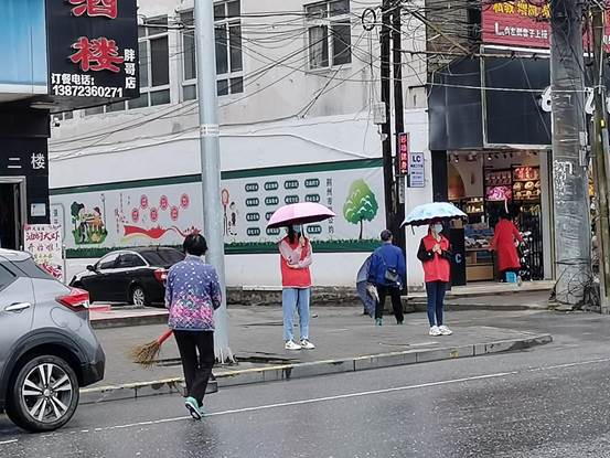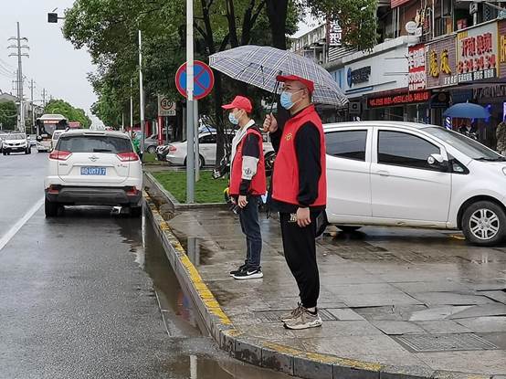 活动时间分为上午八点到十二点、下午两点半到五点半两个时间段,负责相应时间段的志愿者们两两一组被分配到八个执勤地点执勤。下雨天,志愿者们仍然恪尽职守,在相应区域走动,配合城管劝走马路上的所有商贩、督促沿路商户经营范围不得超出门帘下方,劝导骑行人员有序停放共享单车以及电动车,配合清洁工人及时清理大马路中间的垃圾。
