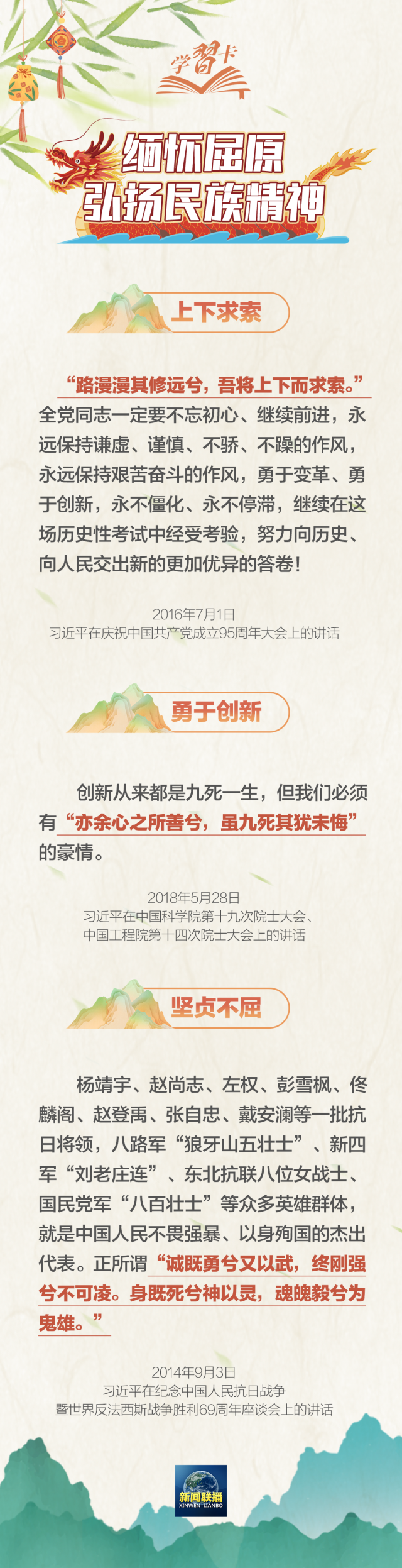 习近平总书记曾多次引用屈原的名句寄情言志、阐述思想,就传统文化的继承和发扬作出重要论述。一起学习↓