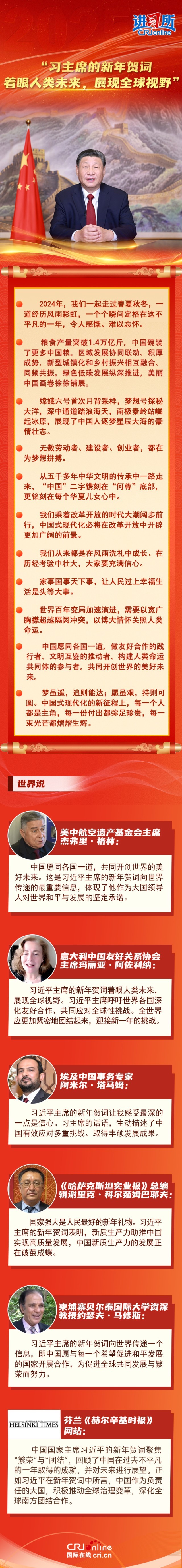 多国人士认为,习近平主席的新年贺词着眼人类未来,展现全球视野,体现了作为大国领导人对世界和平与发展的坚定承诺。