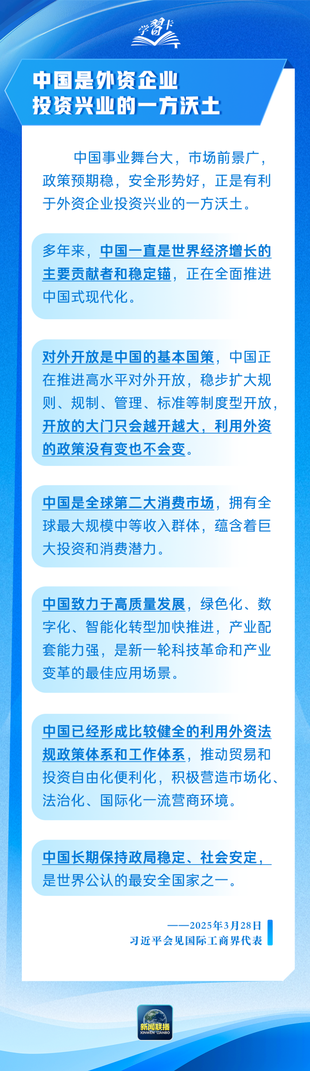 3月28日,国家主席习近平在北京人民大会堂会见国际工商界代表。40余位外资企业全球董事长、首席执行官和商协会代表参加会见,7位外资企业代表先后发言。