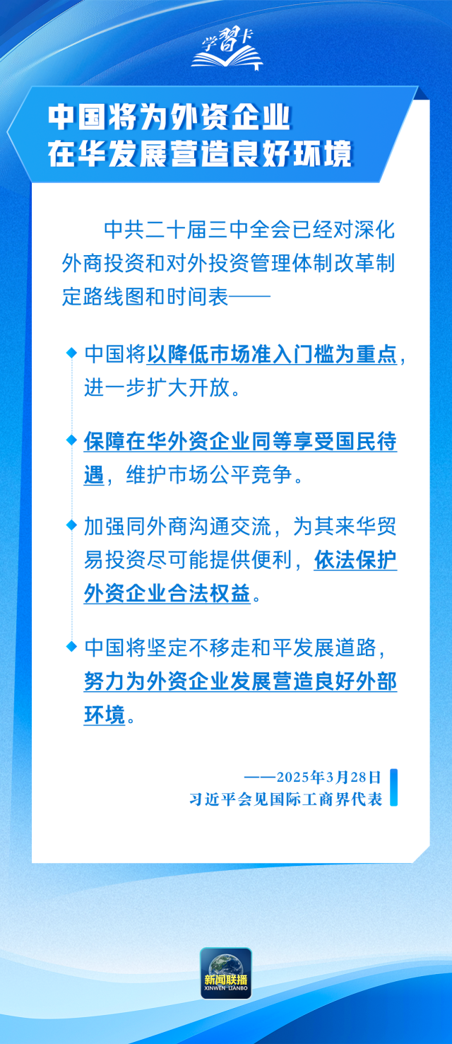 习近平主席强调,中国是有利于外资企业投资兴业的一方沃土,将为外资企业来华贸易投资提供便利,依法保护外资企业合法权益。一起学习↓