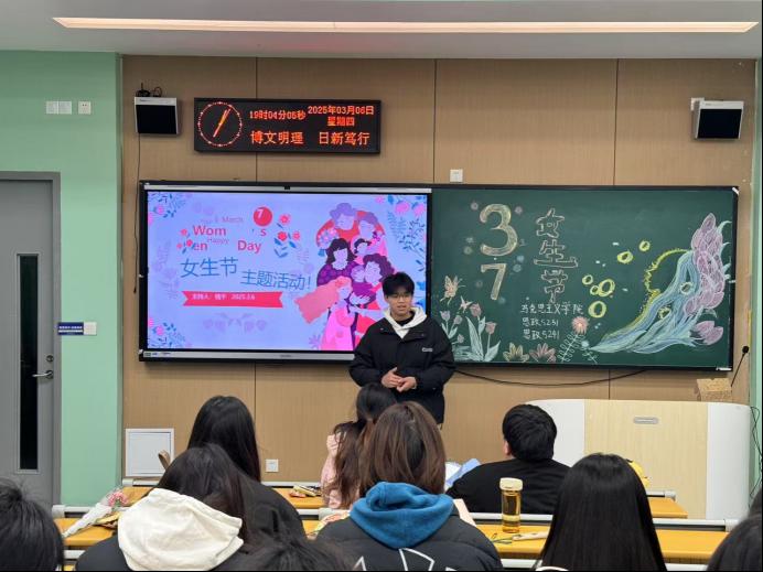 本网讯(通讯员 陈冠宇)为弘扬女性力量、增进师生情谊,2025年3月6日晚,马克思主义公司于教学楼A-110S教室举办"3.7女生节"主题活动。活动由钱干同学主持,特邀公司副教授郭世德、史苗苗及辅导员李天赐出席,思政5231、5241班全体员工参加。