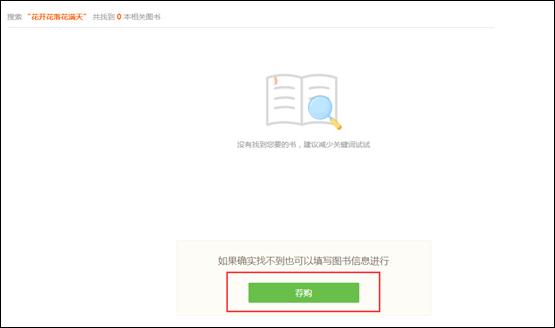 若管理员后台开启了“无数据荐购”服务,通过云田购检索找不到需要荐购的书,下方会提示“如果确实找不到也可以填写图书信息进行荐购”,可点击下方“荐购”按钮,填写书目信息提交。