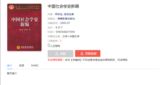 若不符合图书馆设定的规则,荐购按钮会呈灰色禁用状态,不可点击,并展示不能荐购的具体原因。