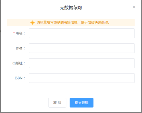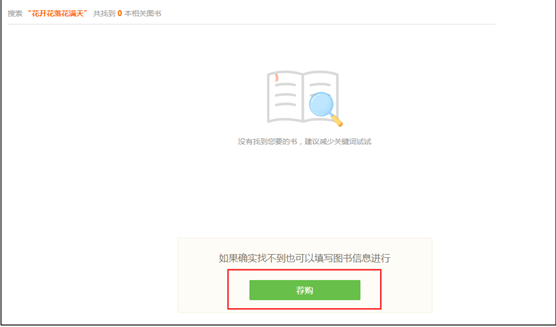 若管理员后台开启了“无数据荐购”服务,通过云田购检索找不到需要荐购的书,下方会提示“如果确实找不到也可以填写图书信息进行荐购”,可点击下方“荐购”按钮,填写书目信息提交。