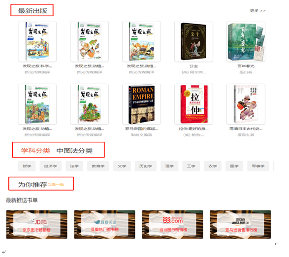 2)通过最新出版、分类浏览、为你推荐、推送书单版块,查找需要的书;