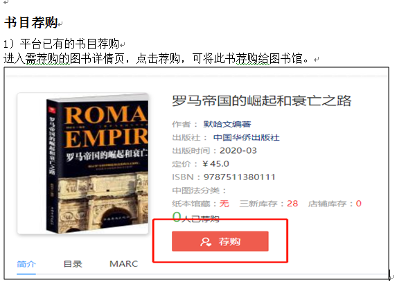 进入需荐购的图书详情页,点击荐购,可将此书荐购给图书馆。