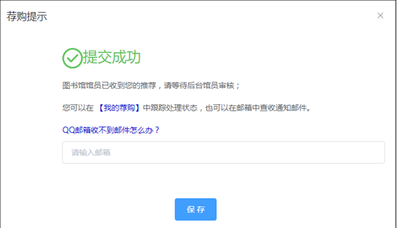 荐购成功弹框界面可输入邮箱地址,输入后保存,当荐购的书有处理状态更新时,会给该邮箱发送通知邮件。