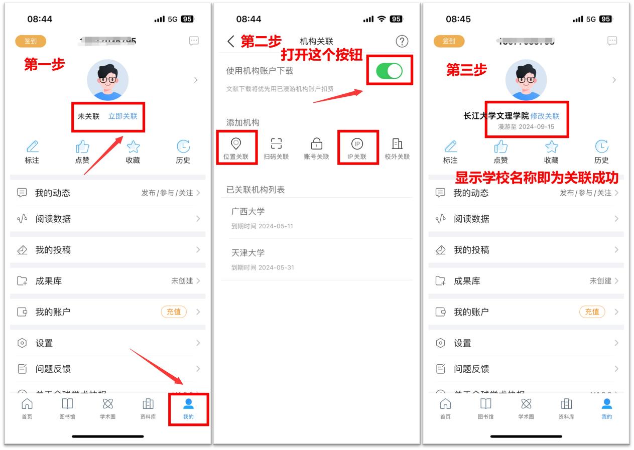 ②IP关联:手机连接校园网后点击“IP关联”即可关联成功。关联成功后任何网络不限IP可免费使用公司采购的知网资源。
