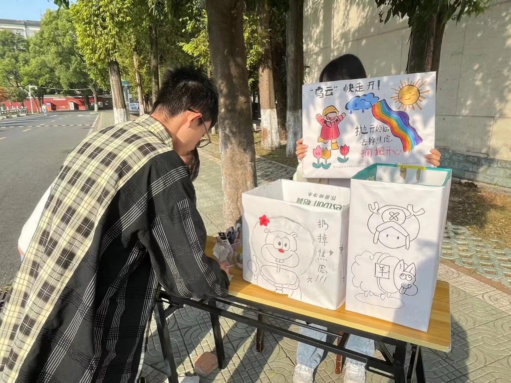 爱出发志愿者服务队开展了“青春战疫 以绘防疫”与“青春战疫 乌云快走开”活动。活动中同学们积极上传绘画和手工作品,一幅幅色彩烂漫、笔触细腻又正能量的作品,描绘疫情下的点滴生活的同时,也诠释着坚定不移的“全民抗疫”精神。同时,同学自行将焦虑或开心的事情投掷相应纸箱也可获得大零食礼包一份。