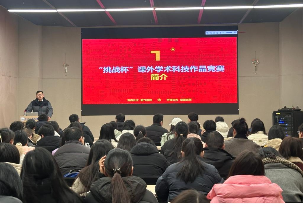 太阳集团tyc9728团委副书记信晓阳以《挑战新时代,青春创未来》为主题,对2025年“挑战杯”(大挑)进行赛事解读,结合自身经验从报名阶段、路演阶段、指导教师指导方向、选题等四个方面进行。
