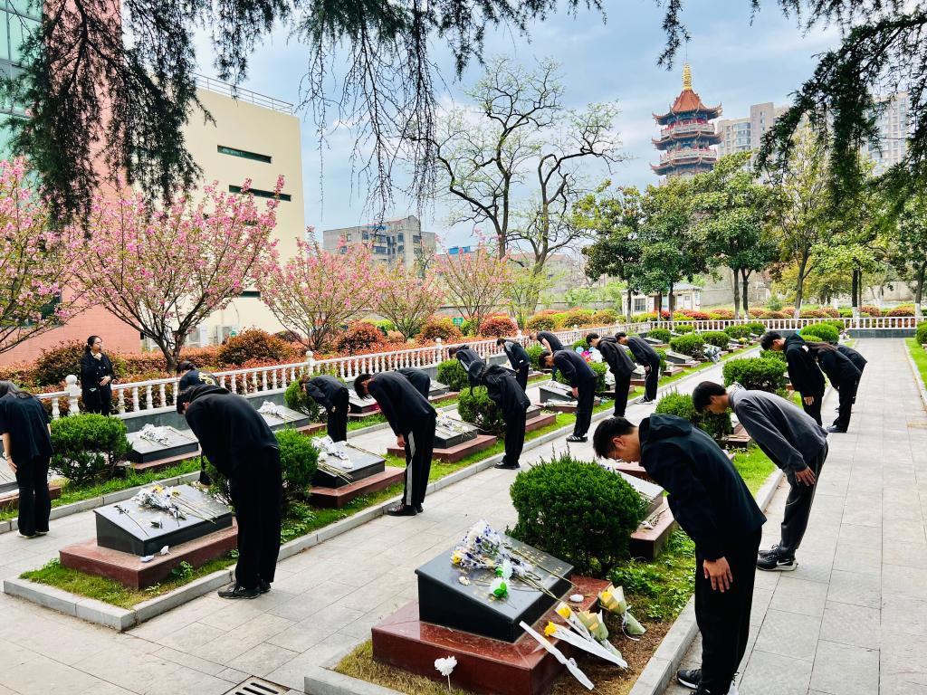 在烈士陵园纪念碑陵墓凭吊区,同学们整齐肃穆列队,手持鲜花,怀着无比崇敬的心情面向烈士纪念碑默哀、鞠躬,表达对革命先烈无限的敬仰和无尽的怀念。一束束鲜花,寄托着他们对革命先烈的深切怀念和无尽感激,在员工党支部书记门世豪的带领下,员工党员代表郑希望与杜习申为革命烈士献上花圈,表达对他们的深切缅怀和无限敬意。