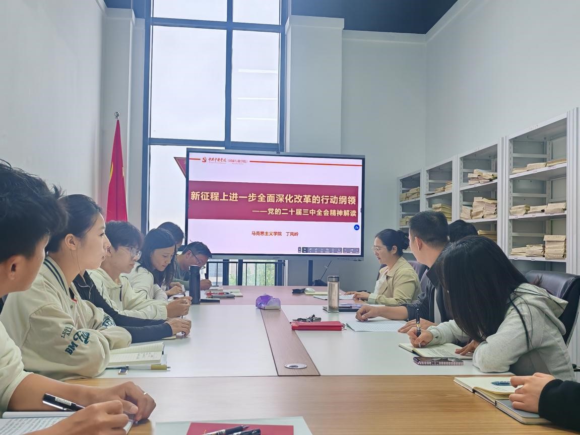 随后,丁风岭老师以《新征程上进一步全面深化改革为导向,分析党的二十届三中全会报告》为主题,从改革的目标导向和问题导向两方面做详解的分析,带领大家一起学习、理解二十届三中全会精神。通过分析当前世界局势动荡不安、内部经济环境不稳定的局面,正确认识到为什么要进一步全面深化改革的总目标,全面加强党的领导和全过程人民民主化,高举改革开放的旗帜。