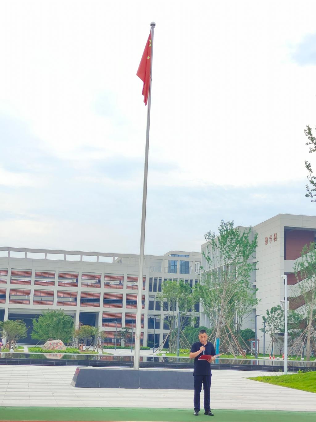 6点55分,随着主持人宣布升旗仪式正式开始,国旗护卫队队员们踏着矫健的步伐将五星红旗护送至升旗台,于7点整准时奏响国歌,在全体师生的注目礼下,五星红旗冉冉升起,迎风飘扬。